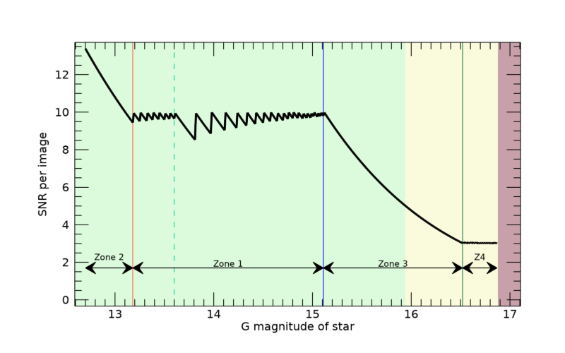 Figure 1 illustrates the behavior of the program. The star brightness is highest on the left, lowest on the right of the plot. The green zones shows cases where good data are ensured, with SNR ≥ 5. Anything in this zone will provide excellent data under clear skies. The yellow zone is not really where we want to be but the data will be usable, if not a little difficult to process. The red zone is beyond the capability of this system and is a waste of time.