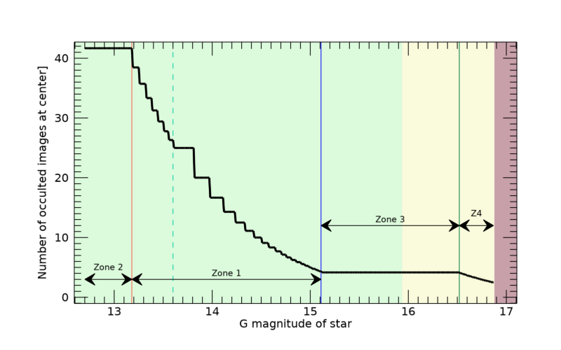The number of occulted images on the centerline provides view of the last portion of the logic used. The figure below shows how the number of samples decreases as the star brightness decreases. You can see how how the requirement of 4 samples across the object freezes the exposure time the SNR drops with decreasing stellar brightness. Eventually, you run out of room and the last zone is dictated by the SNR being clamped at 3 and the number of samples steadily decreases. As soon as you get to a brightness that cannot give you SNR=3 and 2 samples, those fainter stars are of no use.