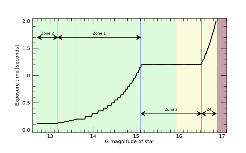 Here is the underlying logic. Zone 1 is in the “sweet spot” of sampling and SNR. There are many choices that will return good data. My choice here is to not get greedy, go slower and take the highest SNR. The sawtooth pattern in the curve is a consequence of the discretized exposure time. Zone 2 includes cases where the star is very bright and gives good data at even the fastest exposure time. There really aren’t any adjustments that can be made here. However, using shortest valid exposure time provides excellent spatial resolution to search for rings and small satellites. Zone 3 covers cases at lower SNR than we’d really like. Here, I insist on at least 4 images across the diameter while maintaining a useful SNR. Zone 4 is the last ditch option. Relax the sampling to just two points across the diameter with SNR≥3.